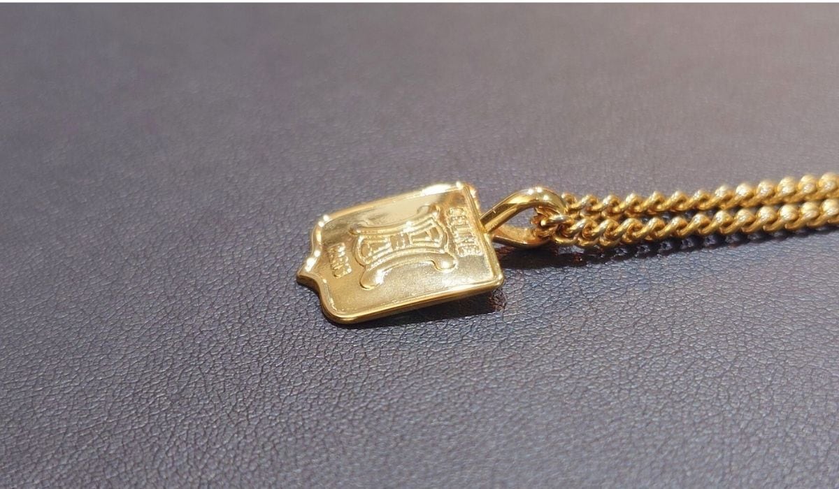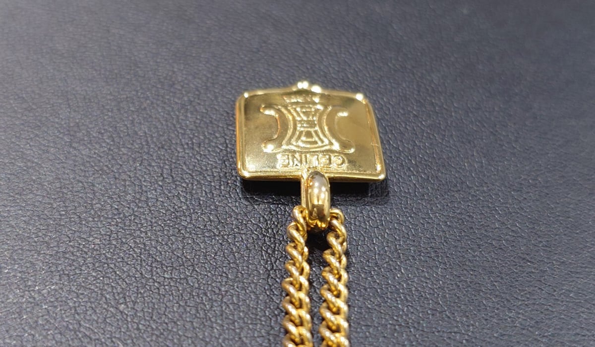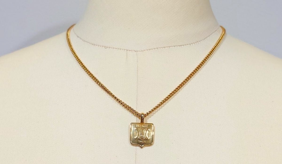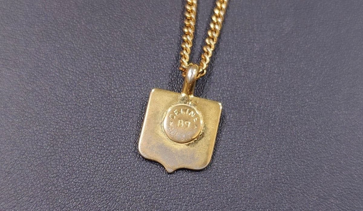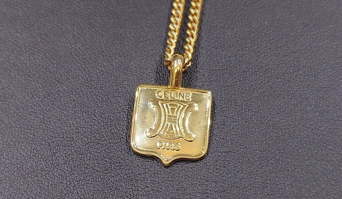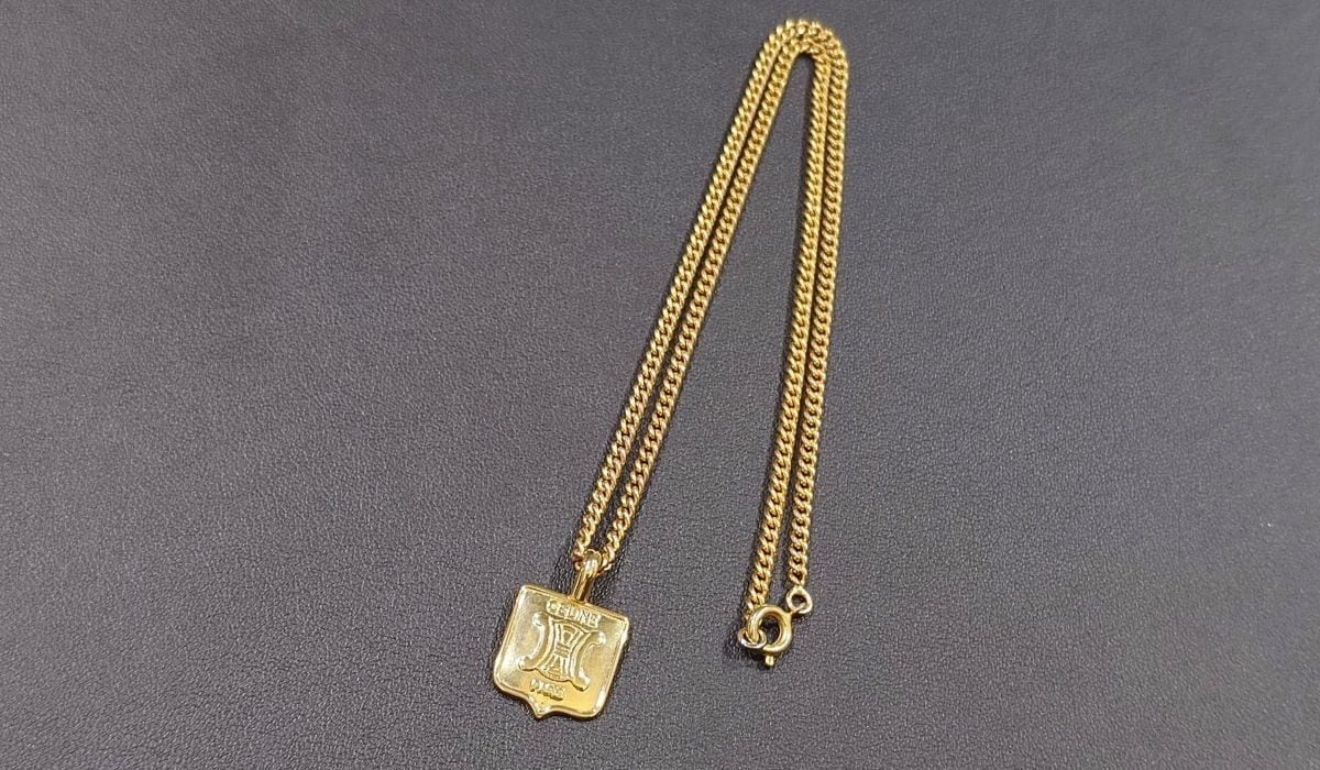 ◎ブラゾンとCELINEロゴのプレートが目を惹くゴールドネックレスです。