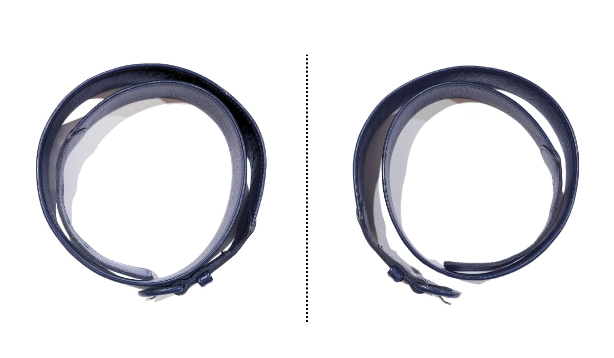 ・バックルまわりのレザーに若干のヨレやスレ、薄いバックル跡があります。大きなキズや変色はありません(写真8、10枚目参照)。