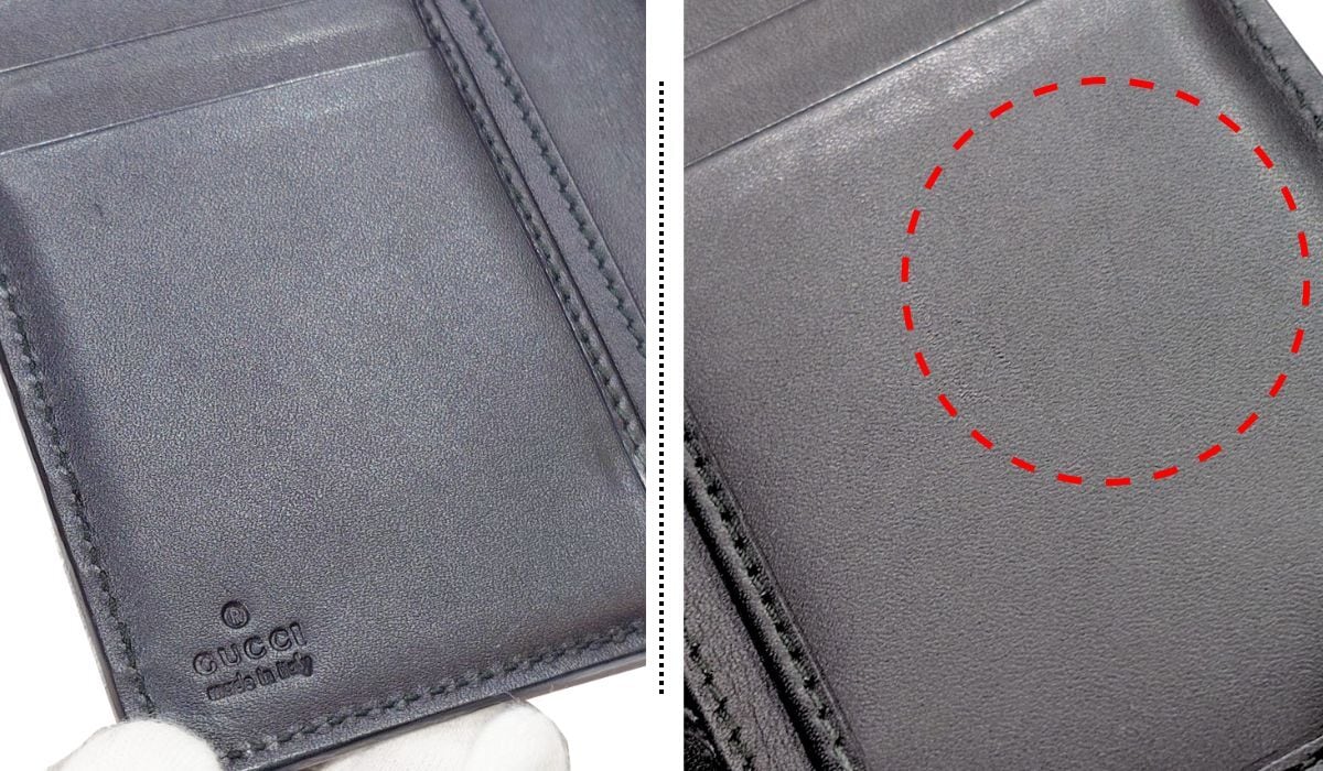 ・内側レザーに汚れ・変色はありませんが3〜4箇所に軽微なスレ・爪傷があります(写真6~7枚目参照)。大きなキズはありません。