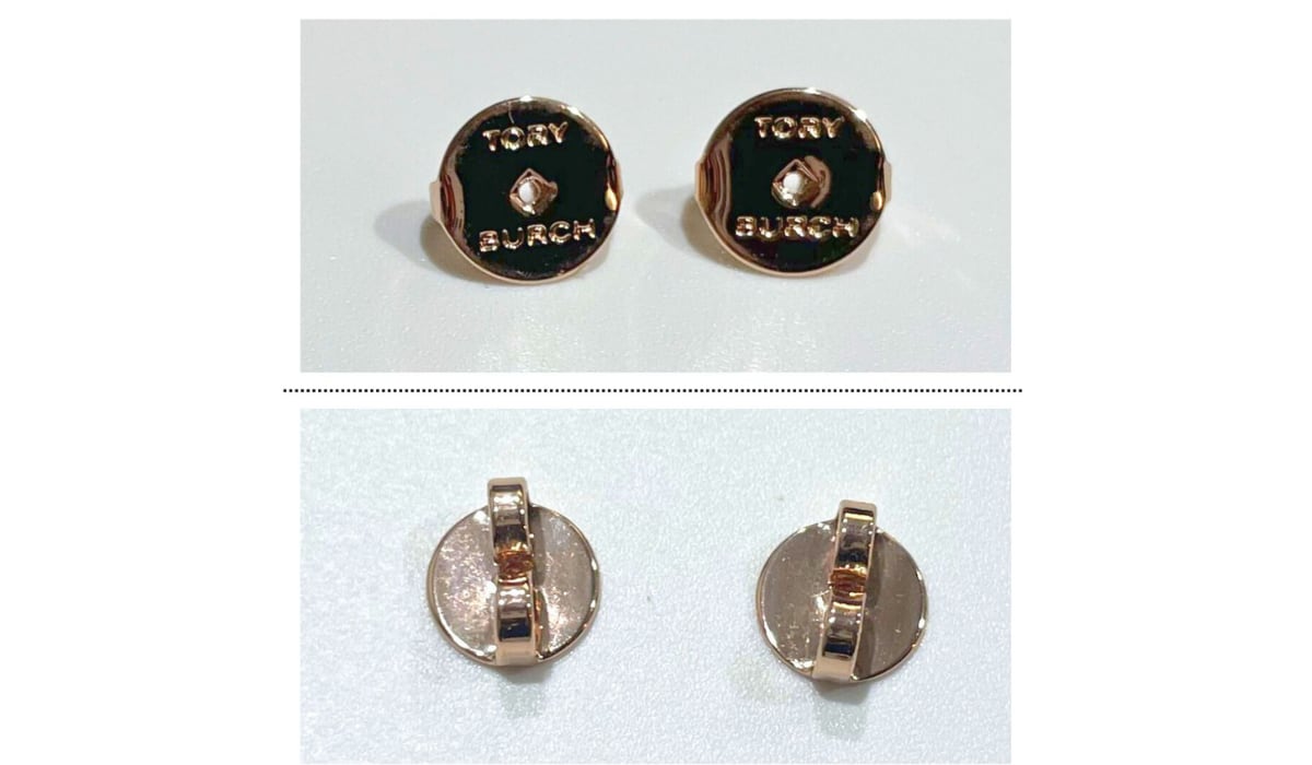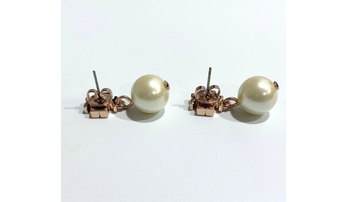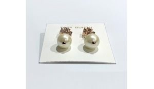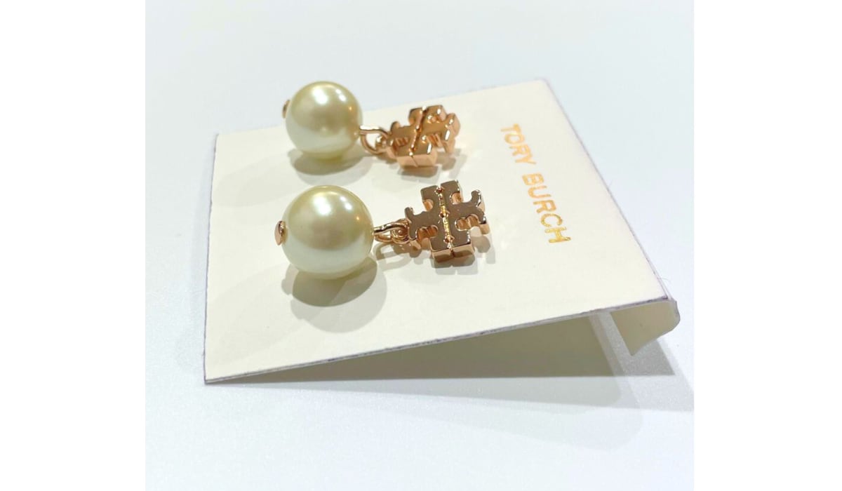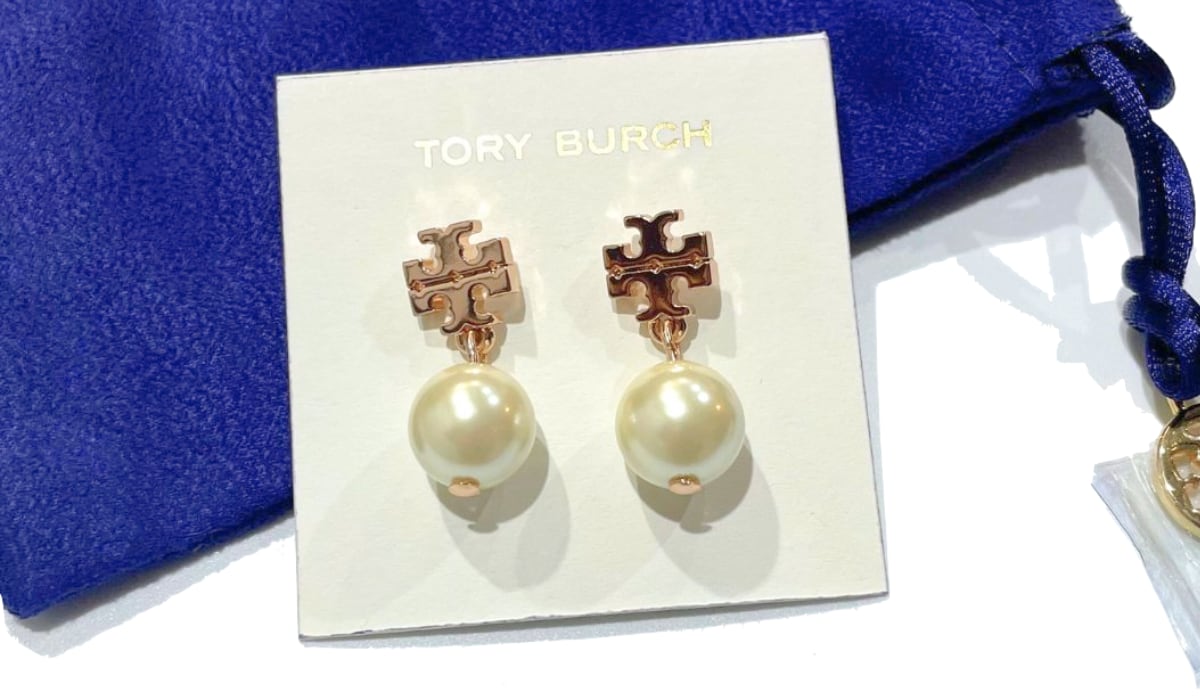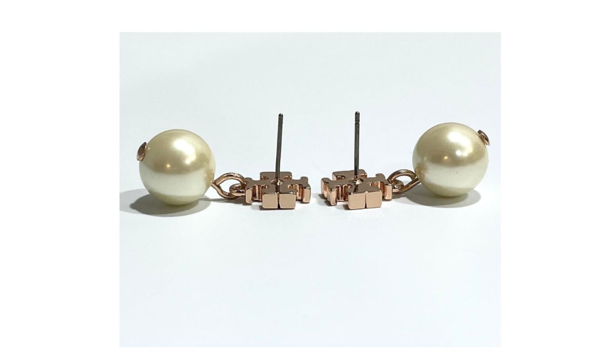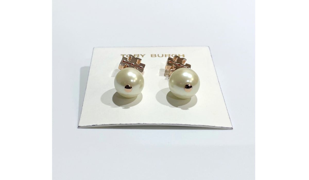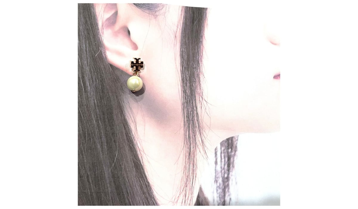 ◎ピンクゴールドのTORY BURCHロゴと大粒のパールの組み合わせがオシャレ!