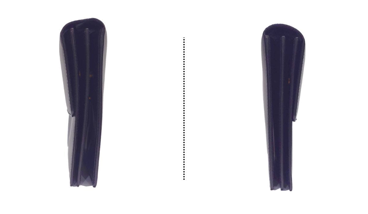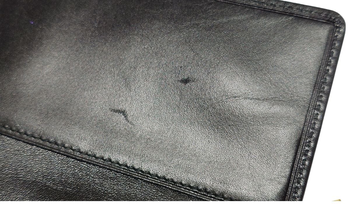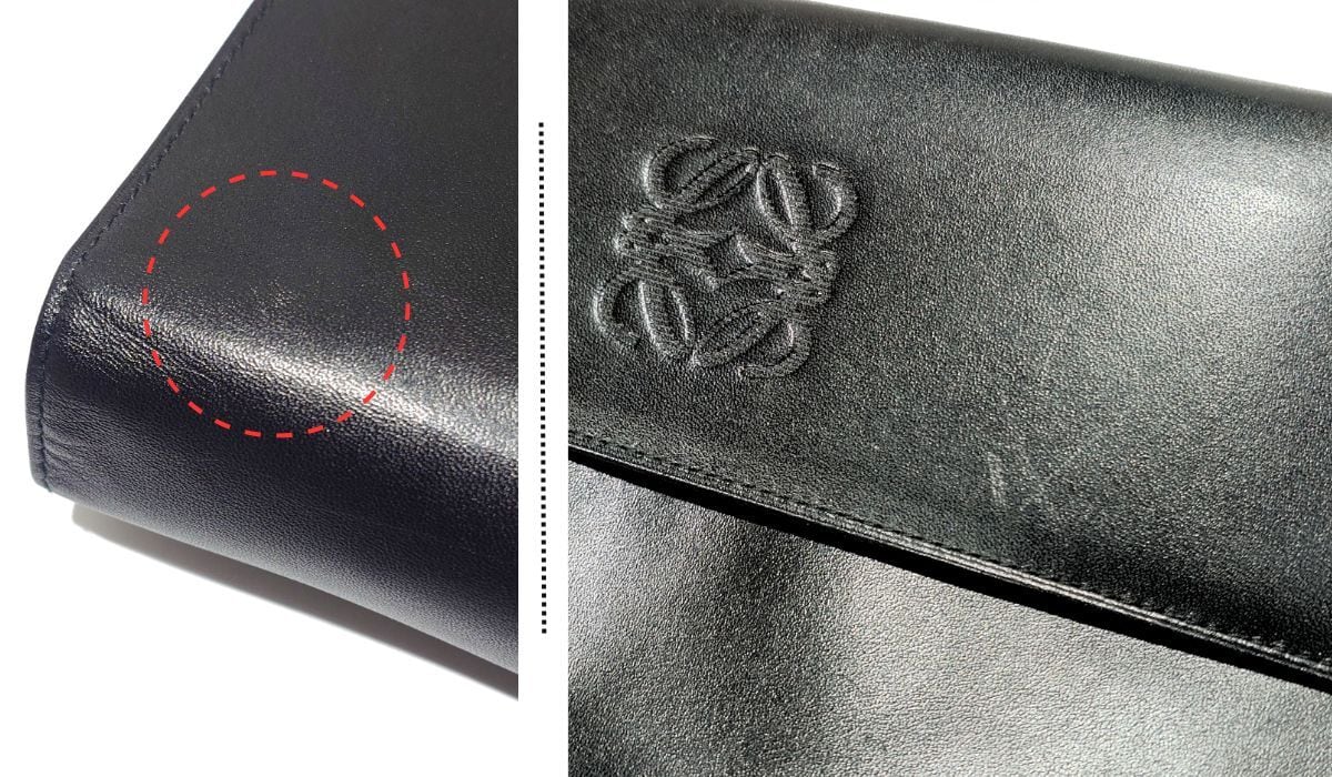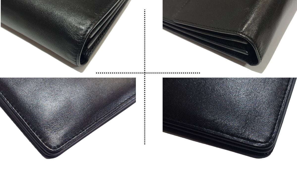 ・外側レザーの2~3箇所に光の加減で見える程度の軽微な爪スレ、1箇所に微細な汚れがあります(写真6枚目参照)。少々のシワ・ヨレがありますが、大きなキズや変色のダメージはありません。角スレもありません。アナグラムの型押しはスレキズなくキレイです。