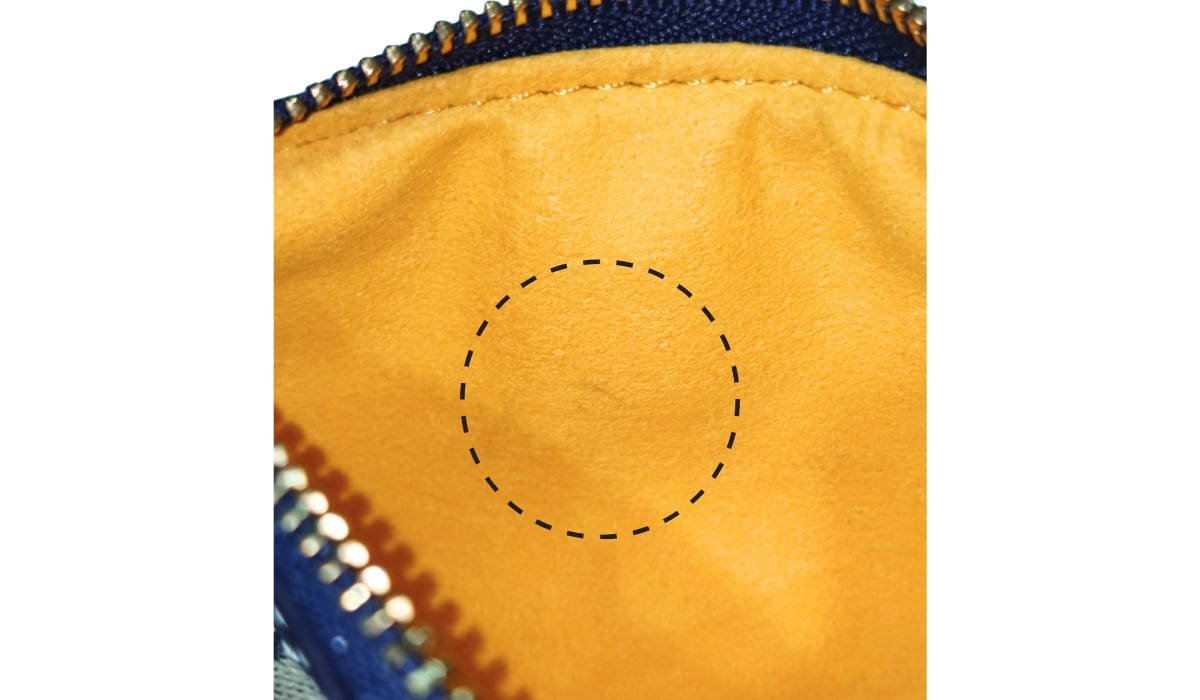 ・内側に1箇所、うっすらとした汚れがあります(写真9枚目参照)。他に目に付くダメージはありません。コイン汚れやコインの押し跡もありません。