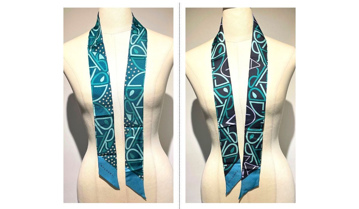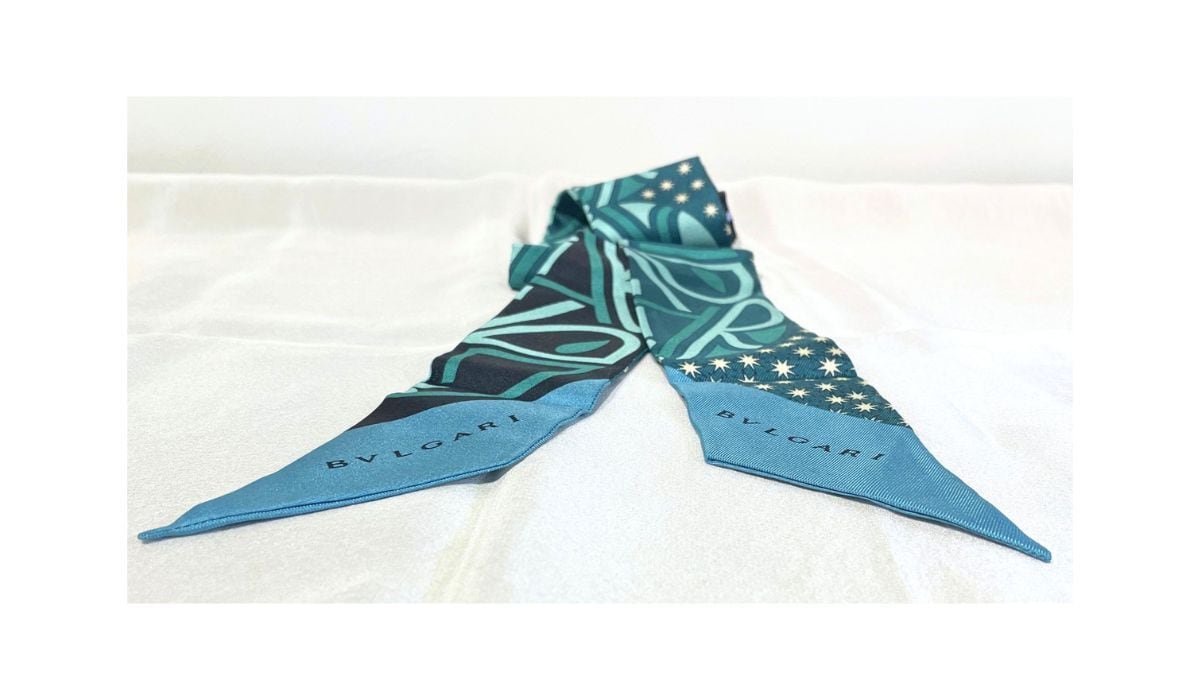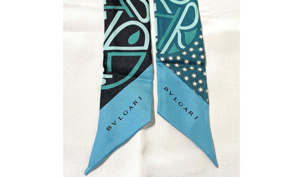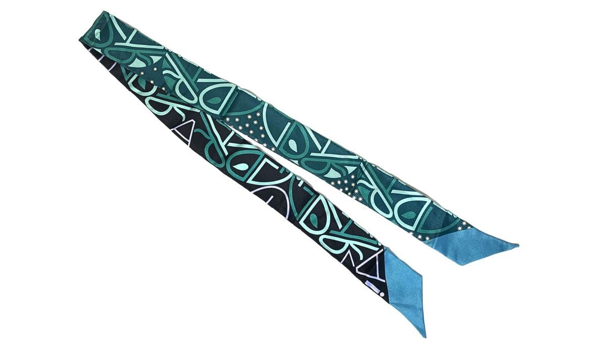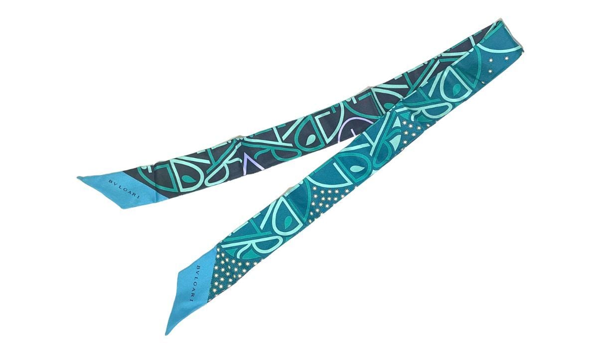 BVLGARI ブルガリ ロゴ シェリー リボン スカーフ シルク グリーン ブラック マルチカラー リバーシブル