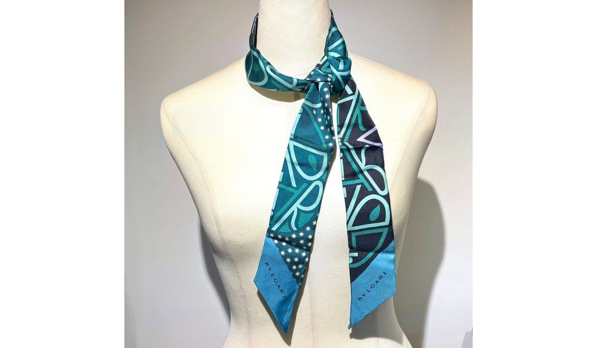 ◎BVLGARIの文字を大胆にデザインしたオシャレなシェリー、リボンスカーフです。