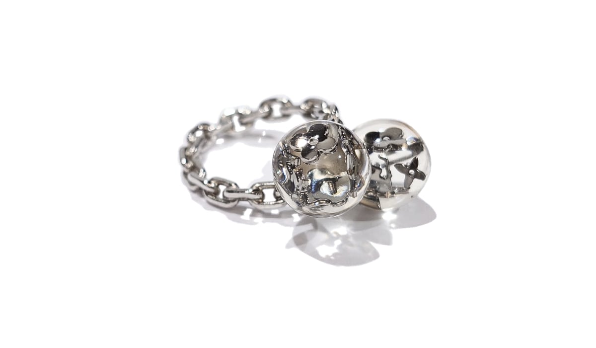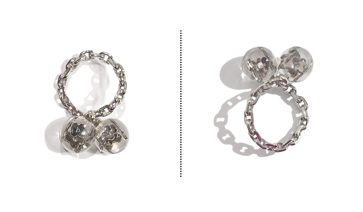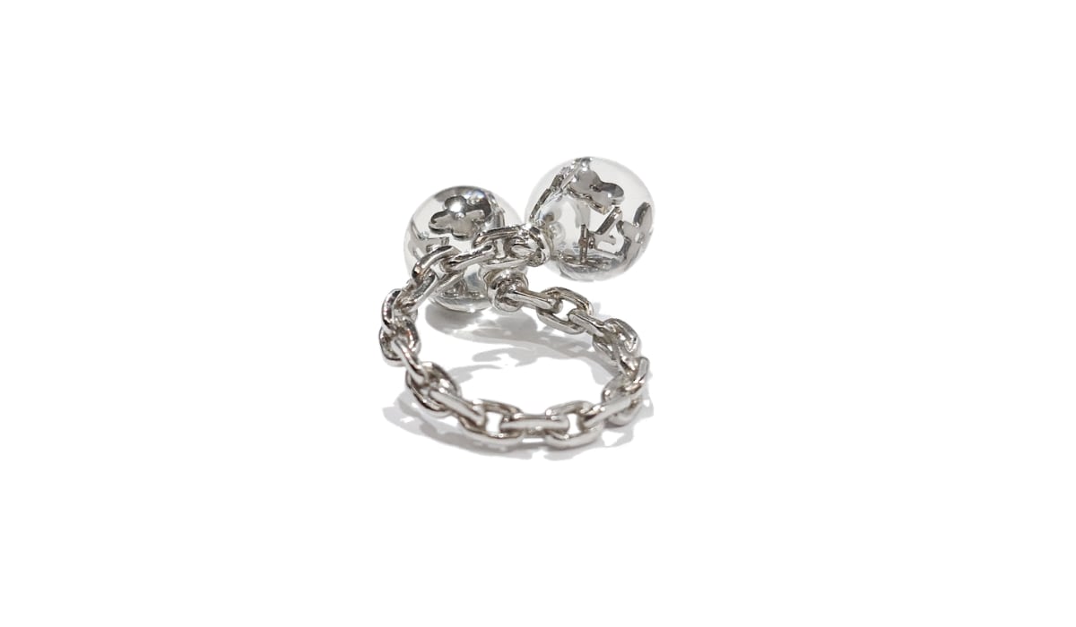 ◎ふたつの透明なボールの中に浮かぶモノグラムフラワーやLVロゴがオシャレなリングです。